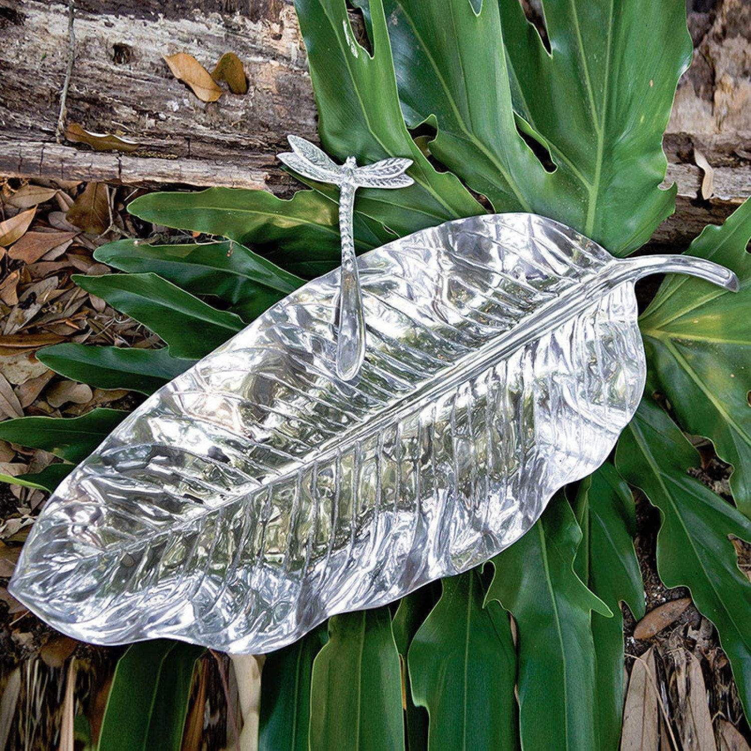 Serene and inspiring, this gleaming metal platter pays homage to Mother Nature in its graceful interpretation of the zebra leaf.