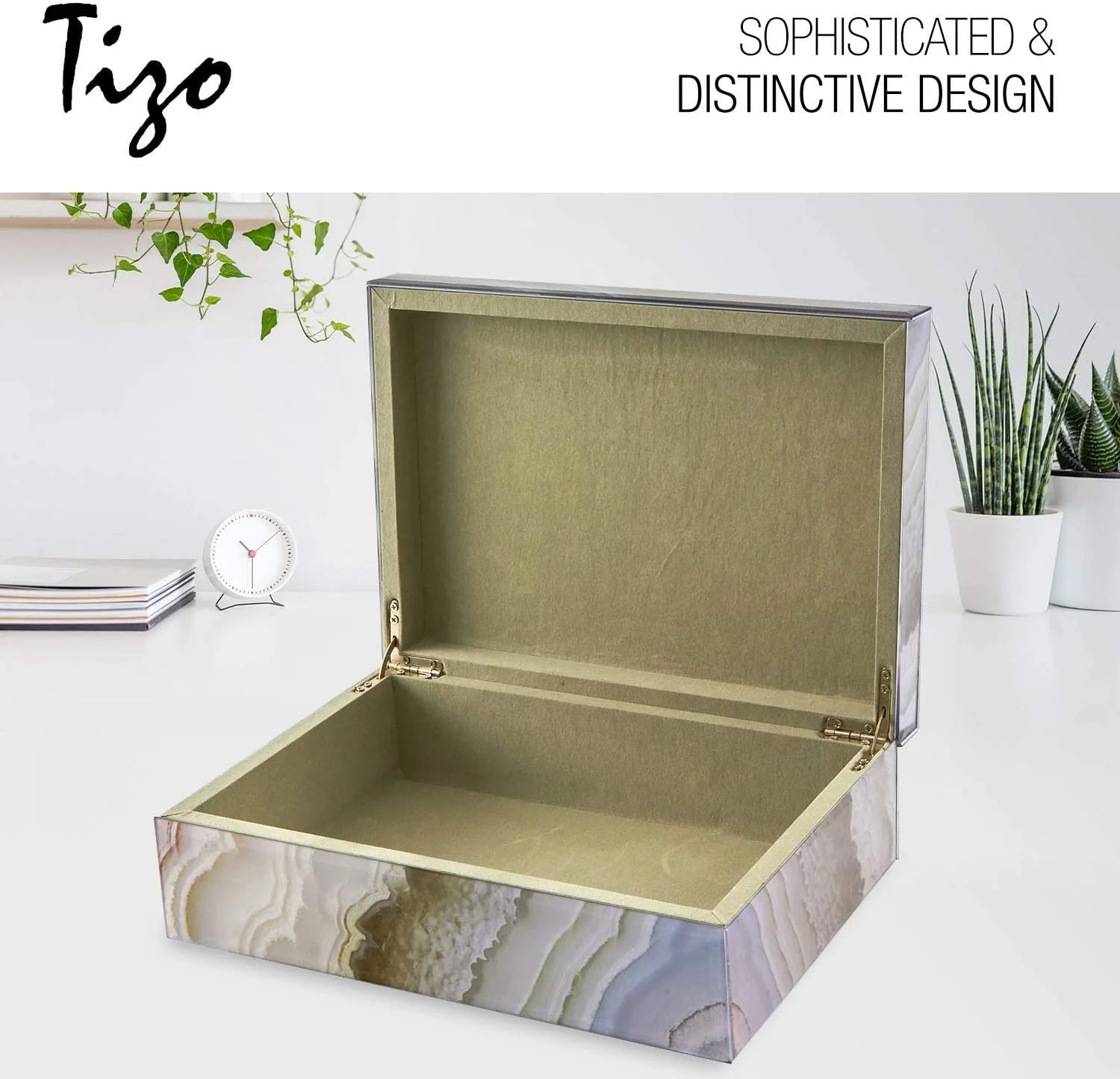 - Elegant Marbled Glass Box – This beautiful and unique box makes a perfect place for keepsakes or desk accessories; Wood base box with marbled design glass-finish outer construction; Large marbled brown design measuring 11" x 8" x 3.5"
