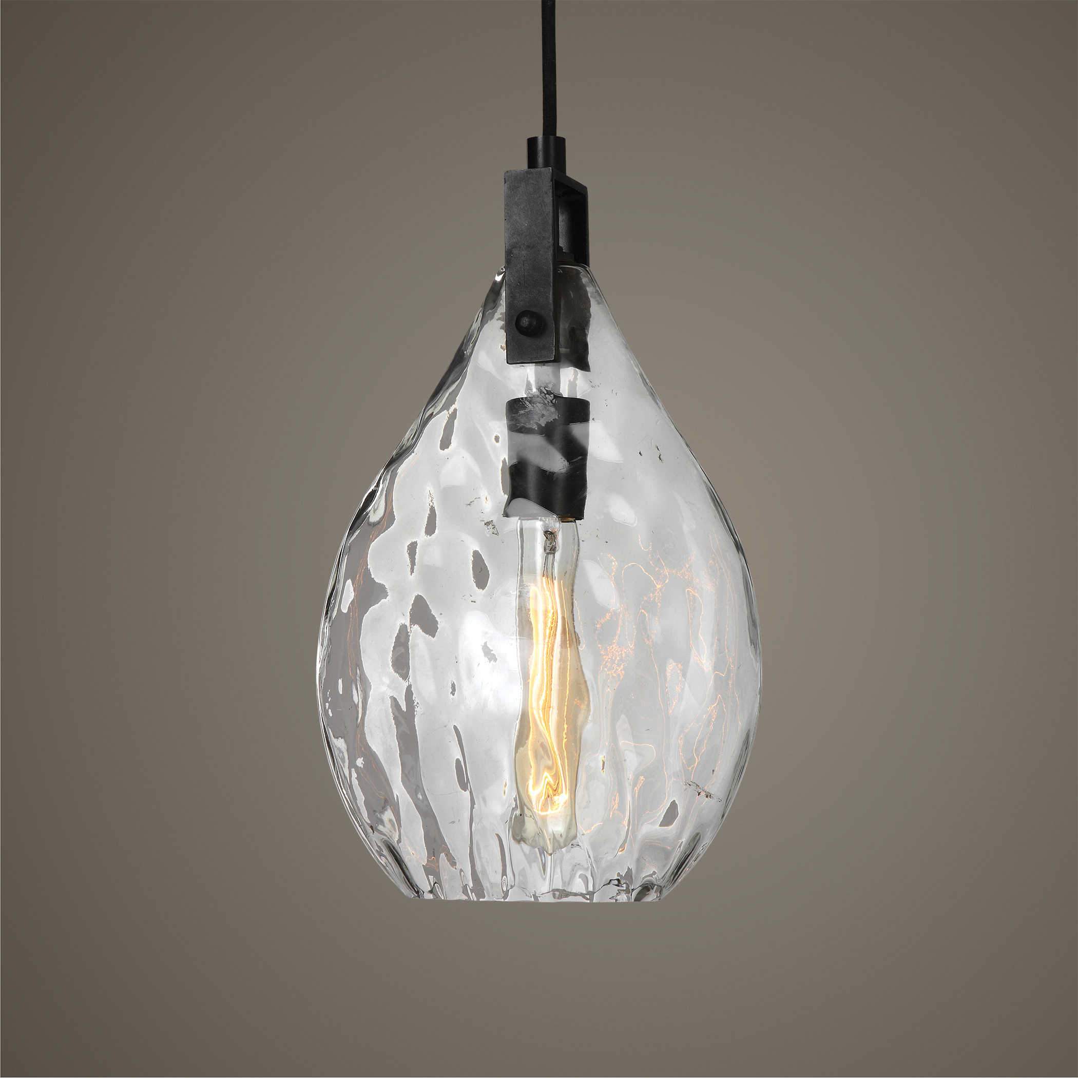 Transitional pendant in a matte black finish with a flat clear teardrop shaped watered glass. From the front view it is a teardrop shape from the side it is only 4" wide and flat with matte black accents. Includes a black 15' cord and black canopy. Includes 60 watt T10 bulb.