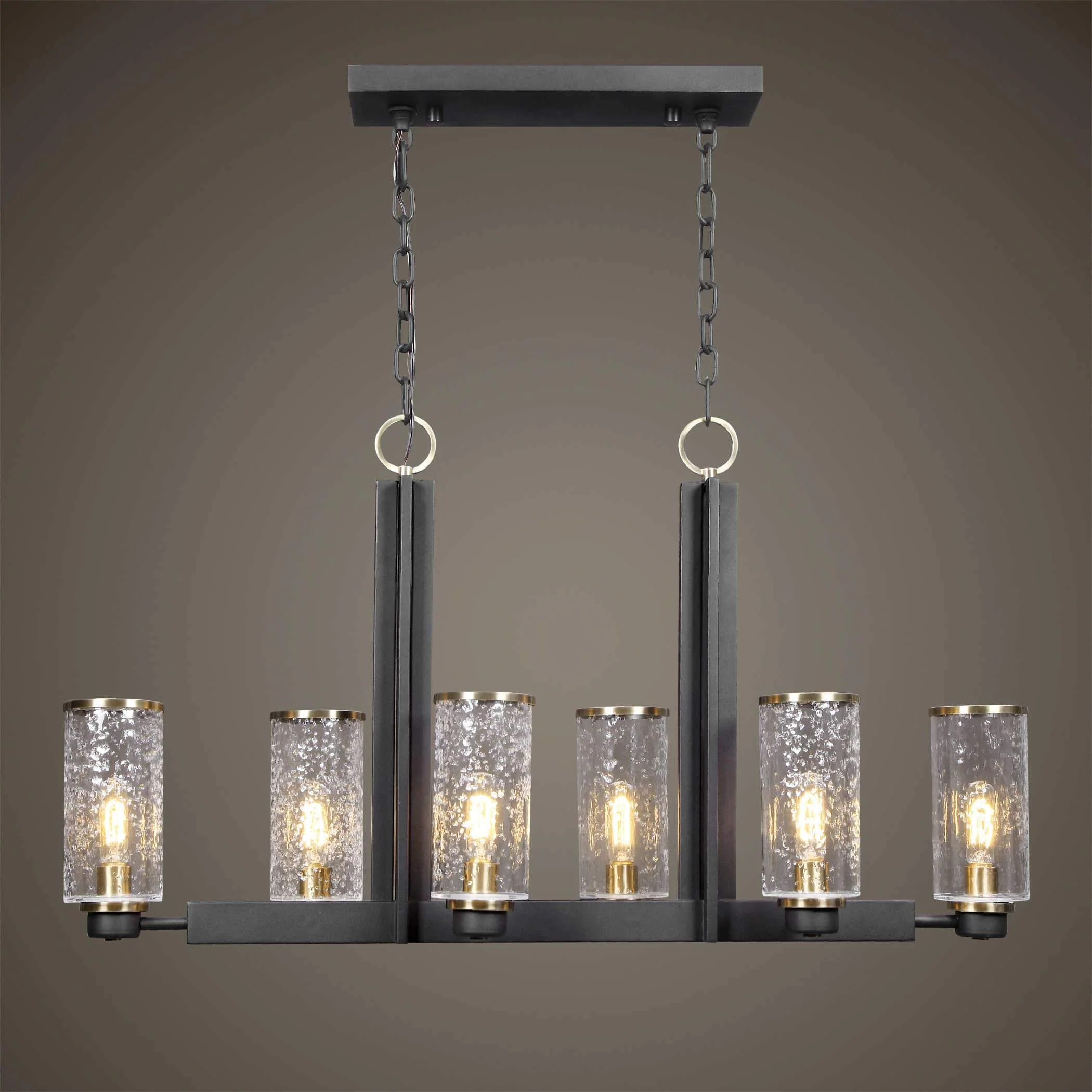 Refined industrial with clean lines on our 6 Lt.Island features a sanded black finish on the I-beam style frame with refined antique brass accents and clear meteor shower glass shades. Supplied with 6-60 watt max Edison sockets also includes 7' of chain and 20' of wire for adjustable installation.