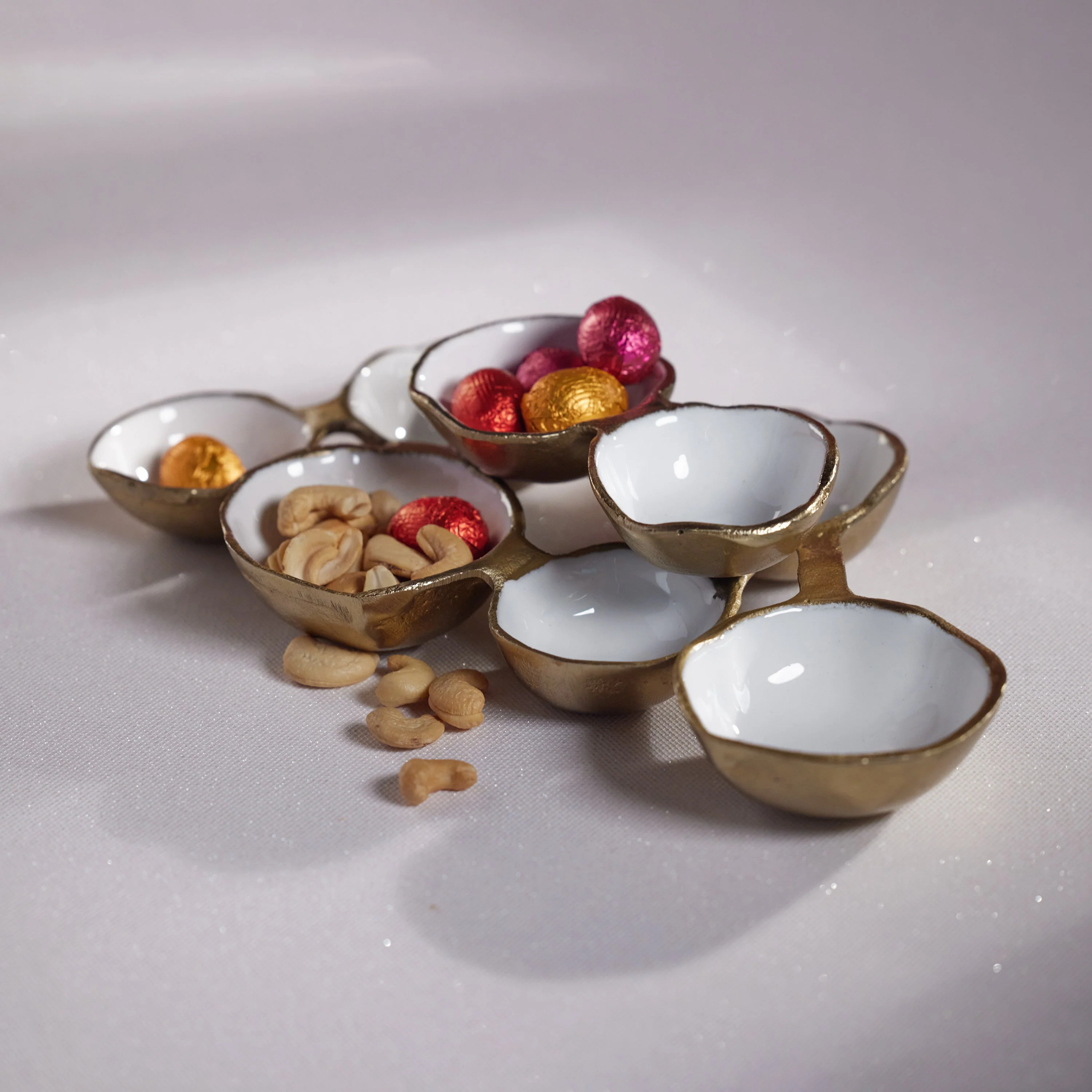 This cluster of 8 serving bowls is perfect for displaying and serving appetizers, chips, and dips. The gold and white design adds a unique touch to any table setting. With a variety of serving options, these bowls are a versatile choice for any occasion.