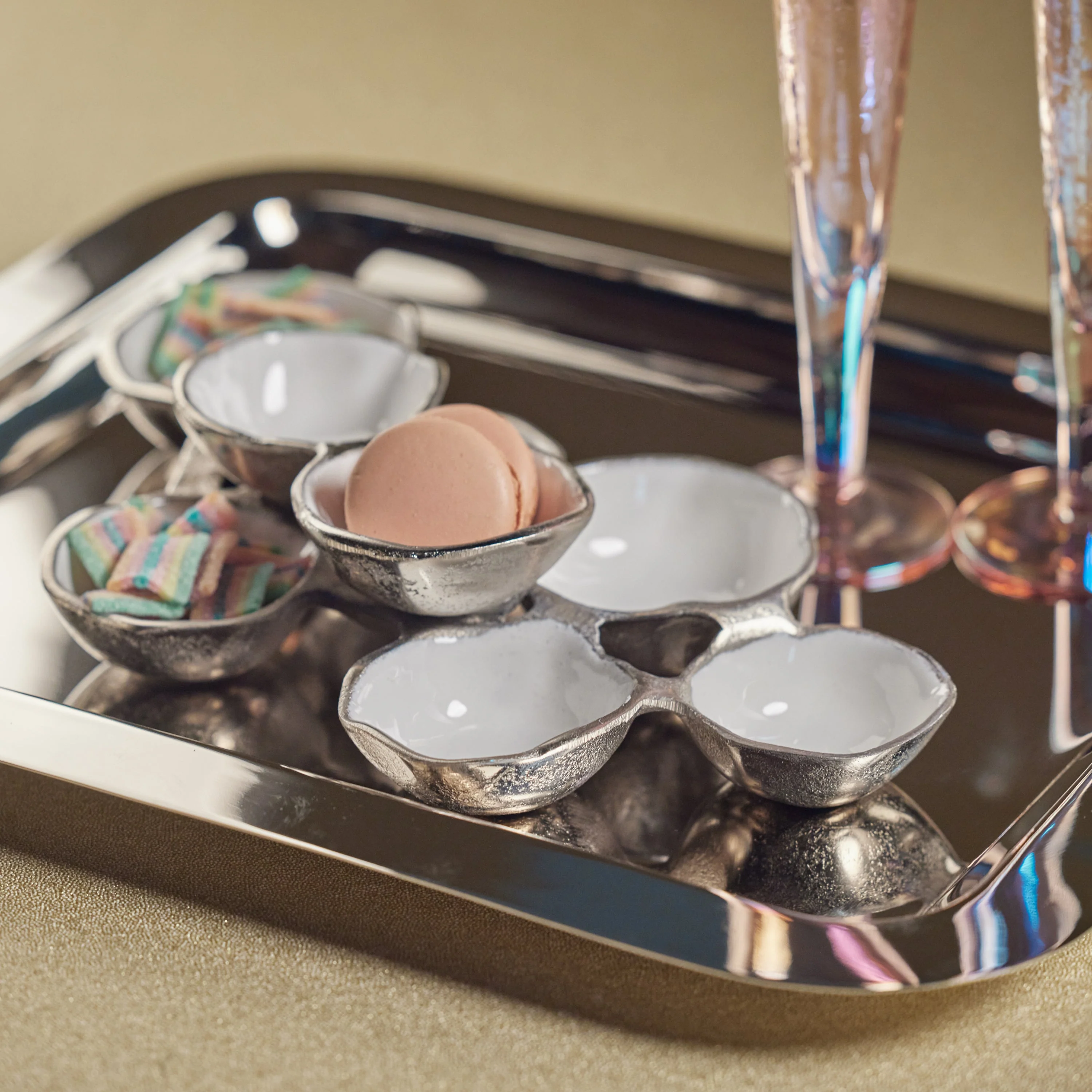 This cluster of 8 serving bowls is perfect for displaying and serving appetizers, chips, and dips. The nickel and white design adds a unique touch to any table setting. With a variety of serving options, these bowls are a versatile choice for any occasion.